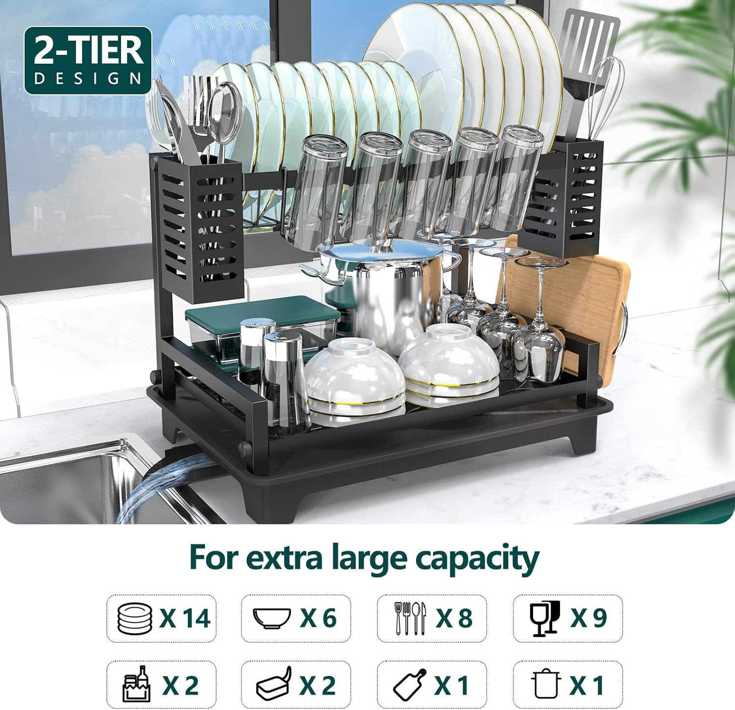 B-Land Dish Drying Rack: 2 Tier Dish Racks for Kitchen Counter and Sink – Large Dish Drying Rack with Drainboard & Utensil Holders – Stainless Steel Dish Drainers Kitchen Organization and Storage