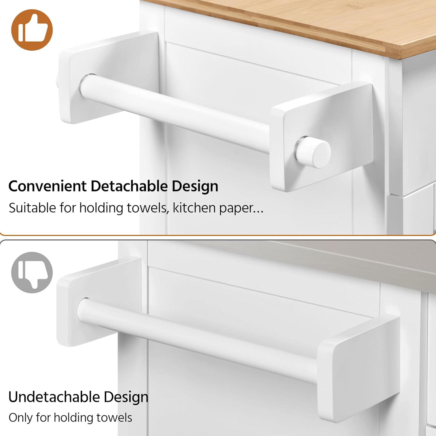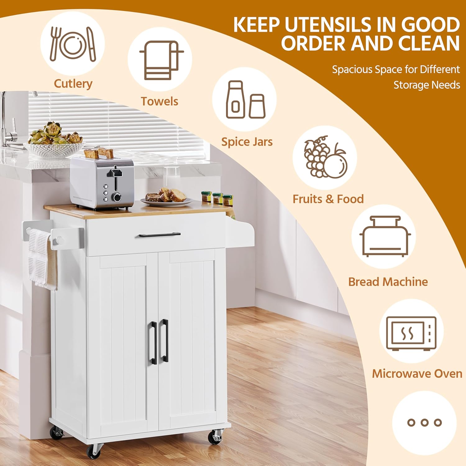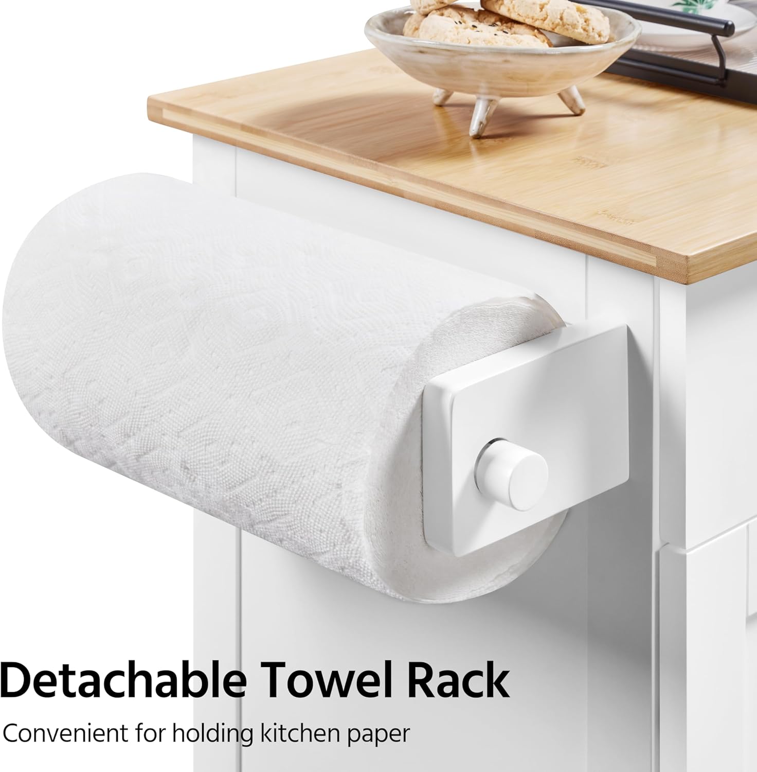 Equipped with a storage cabinet, spice rack, and towel bar, this kitchen cart is designed to keep your essentials within reach and neatly organized. Whether you’re hosting a dinner party or simply looking to streamline your cooking routine, this multifunctional cart is the perfect addition to your dining room, kitchen, or living room.